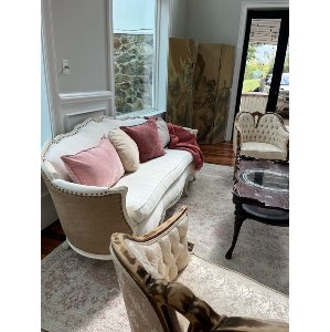 Beautiful vintage sofa covered in quilted white matelasse fabric with nailhead trim. Wrapped in a soft sand-colored weave, its frame is painted and distressed in cream.